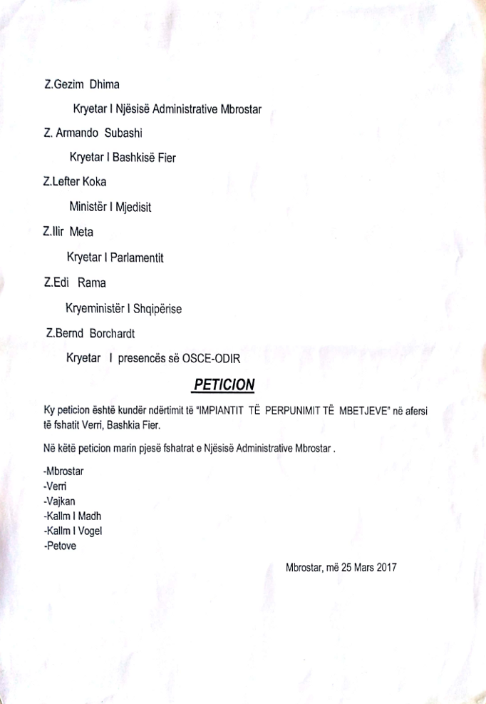 Banorët e Verrisë dhe fshatrave përreth të kërcënuar seriozisht nga incineratori, kanë më shumë se një vit që protestojnë, por pa djegur e pa thyer as një xham. Informacioni për ta është vetëm rrethimi i vendit të incineratorit dhe një tabelë e vendosur atje me kordinata, të gabuara që nuk i përkasin atij vendi. Banorët qysh para një viti kanë firmosur, duke paraqitur kartën e tyre të identitetit, kundërshtimin e tyre të hapur për ndërtimin e incineratorit nëpërmjet peticionit drejtuar autoriteteve të vendit përfshi z. Rama.