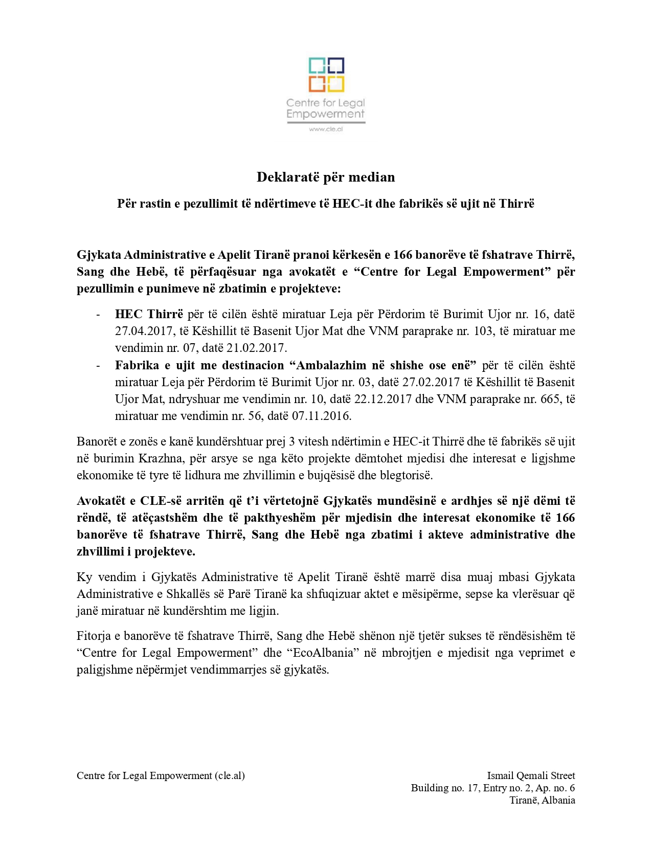 Gjykata Administrative e Apelit ka vendosur pezullimin e punimeve për ndërtimin e një hidrocentrali dhe një fabrikë uji në burimin Krazhna në këto zona, duke i dhënë të drejtë 166 paditësave banorë të komunitetit, CLE-së dhe Eco Albania në mbrojtjen ligjore të cështjes.