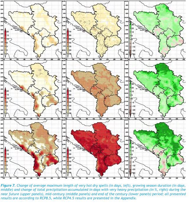 “Mesatarja e gjatësisë dhe frekuenca e valëve të të nxehtit po rriten lehtësisht me ndryshime të mundshme më të theksuara në disa rajone të jugut çka lajmëron për një rritje ndoshta më ekstreme sesa shihet, veçanërisht në zonat bregdetare të Shqipërisë, në zonën Jugore të Bosnjës , Në Podgorice dhe juglindja e Maqedonisë”, vlerëson studimi.
