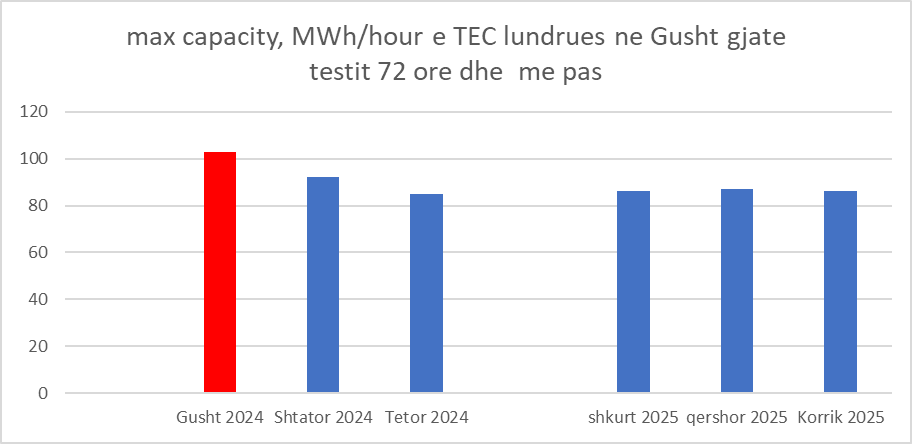 Nuk mund të mos përmendet fakti që përvec muajt Gusht 2024, që kompania bëri testin e komisionimit dhe që rezulton sipas OST që ështe arritur deri në një prodhim prej 100 MWh, në të gjithë muaj pasardhës në asnjë orë të punës nuk është arritur prodhim sa në testim, por qe rrahin afro 85 MWh. (grafik. 7) Nuk dihet pse ky reduktim, ndërsa në kontrate thuhet se kapaciteti është 114 MW.