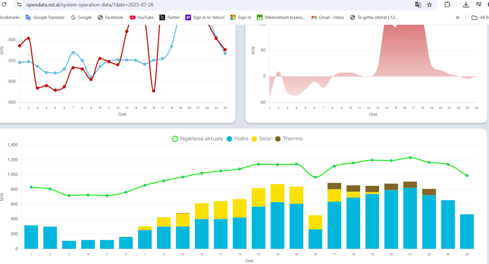 Në një nga ditët, konkretisht më 26 Korrik është ndezur TECi lundrues prej orës 17 deri në orën 22. KESH per te plotesuar nevojat e javës ka importuar energji elektrike, sipas një grafiku të miratuar (pjesa me hapsirën e bardhë poshtë vijës së ngarkesës aktuale, në grafikun e poshtëm). Në këtë grafik janë paraqitur orët dhe prodhimi nga TECi lundrues me ngjyrën e zezë. (graf 3)