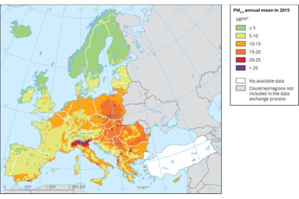 Një studim i qeverisë Britanike përcakton se përqendrimet mesatare për orë të PM 2.5 brenda 20 km kanë një korelacion të fortë (koeficienti i korrelacionit> 0.8). Korrelacioni më pas bie me distancën, por është akoma i lartë në ndarjen deri në 100 km (koeficienti i korrelacionit ~ 0.7).