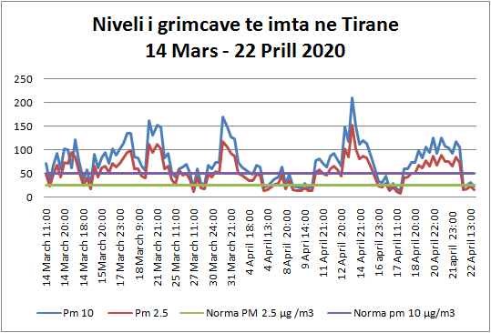 Lajmi i keq është, ndryshe nga perceptimi i gjithkujt se karantina ka pastruar ajrin, në Tiranë rezulton se nuk është e vërtetë. Nga një vrojtim i 117 matjeve prej 14 Marsit deri në 22 Prill të këtij viti pandemik në 4 pikat përfaqësuese të Tiranës PM 2.5 rezulton të jetë 2 herë më e lartë se norma e përcaktuar nga OBSH (grafik 1) dhe ne 7% të rasteve rezulton 4 herë më e lartë se standarti. Një tjetër fenomen paradoksal është se ndotja më e madhe rezulton në darkë, kur qarkullimi i mjeteve shkon në zero.